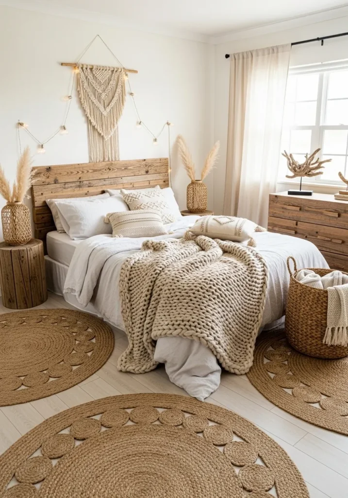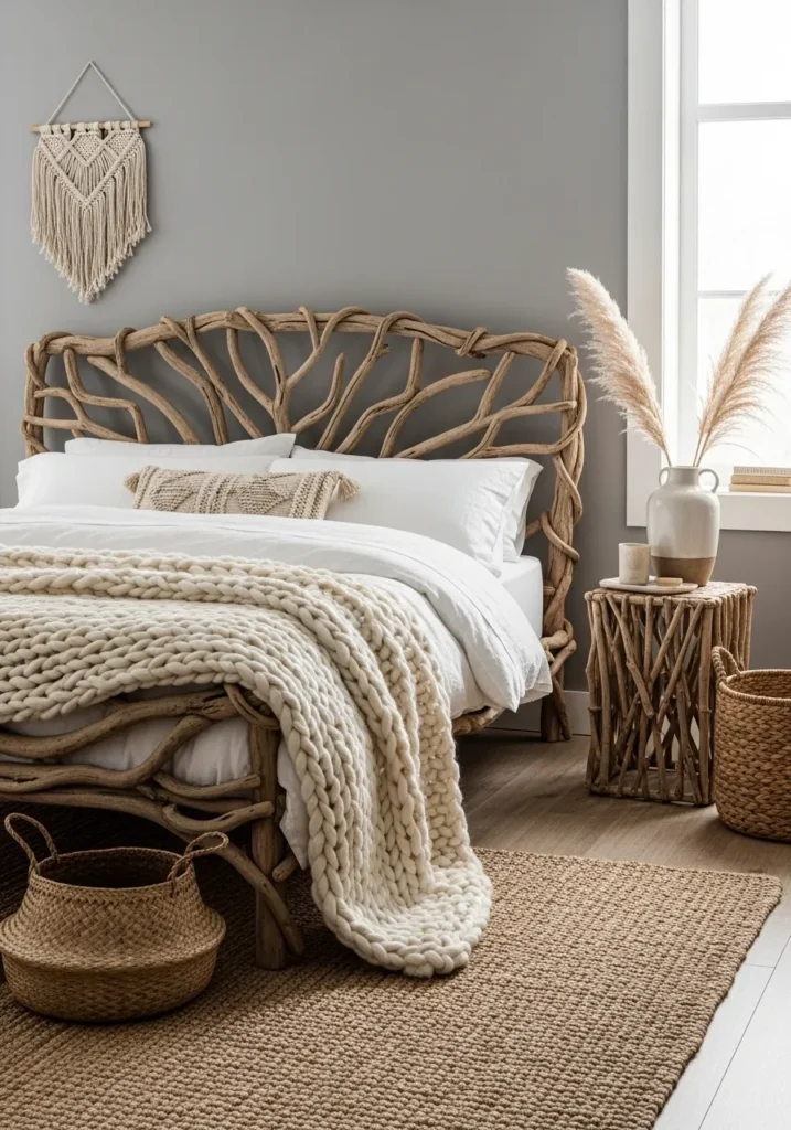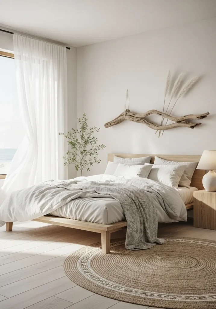 Use driftwood-inspired furniture like a reclaimed wood headboard, rustic nightstands, or a bench at the foot of your bed. Keep your color palette earthy and cool, mixing whites, soft grays, and light browns.
