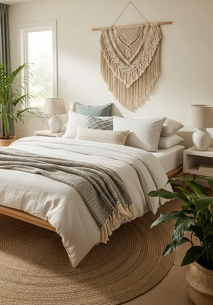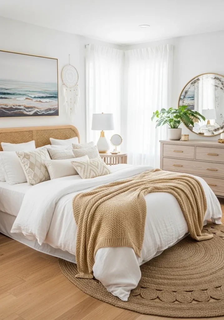 The result is a calm, grounded space that feels perfectly balanced between boho comfort and coastal simplicity.