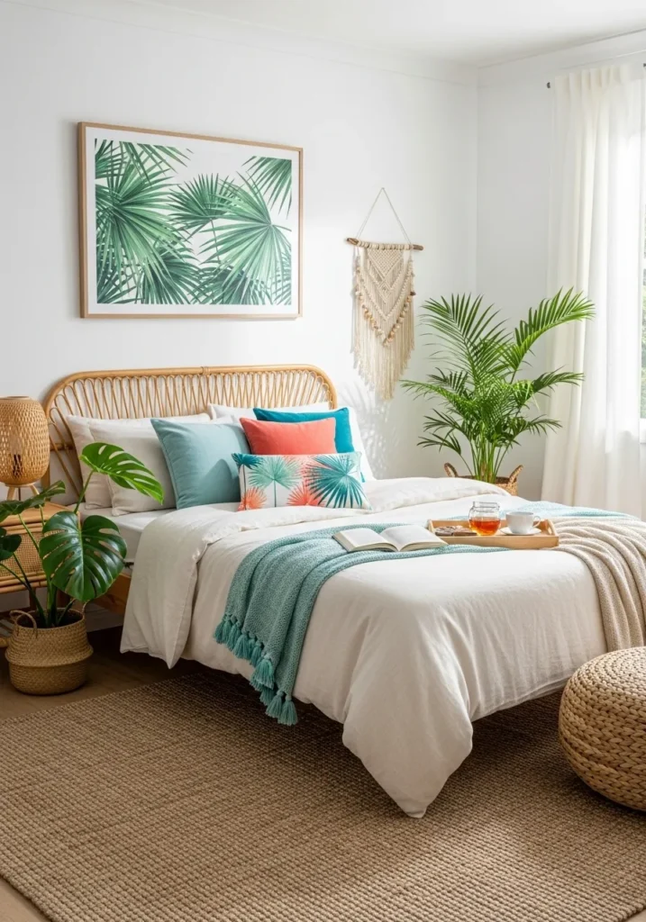 Use a base of white or cream walls, and introduce palm prints, rattan furniture, and green accents. Add large plants like monstera or banana leaf for that tropical touch.
