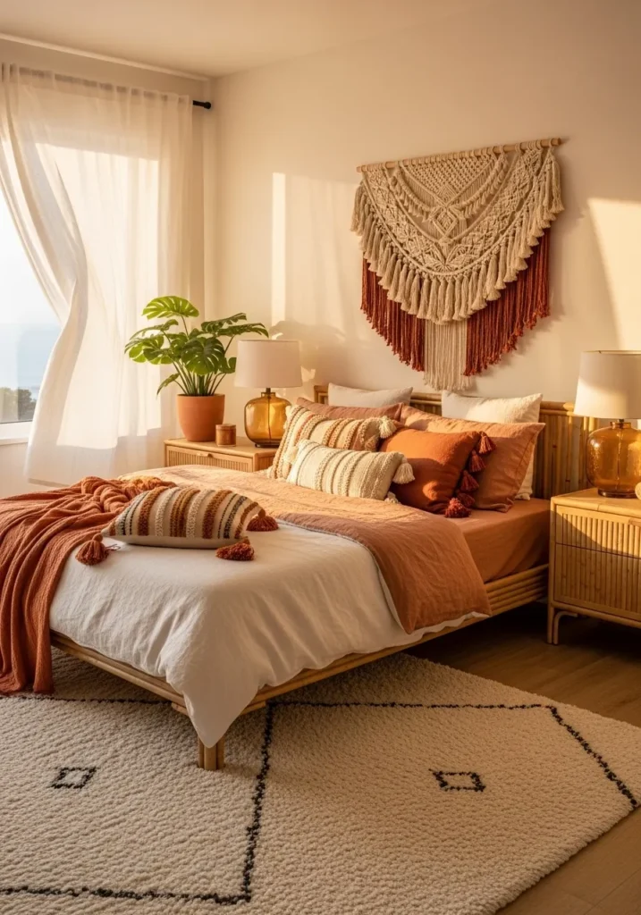 Use a soft blend of terracotta, peach, and golden tones with creamy whites. Add warmth through woven wall hangings, tassel pillows, and amber glass lamps.