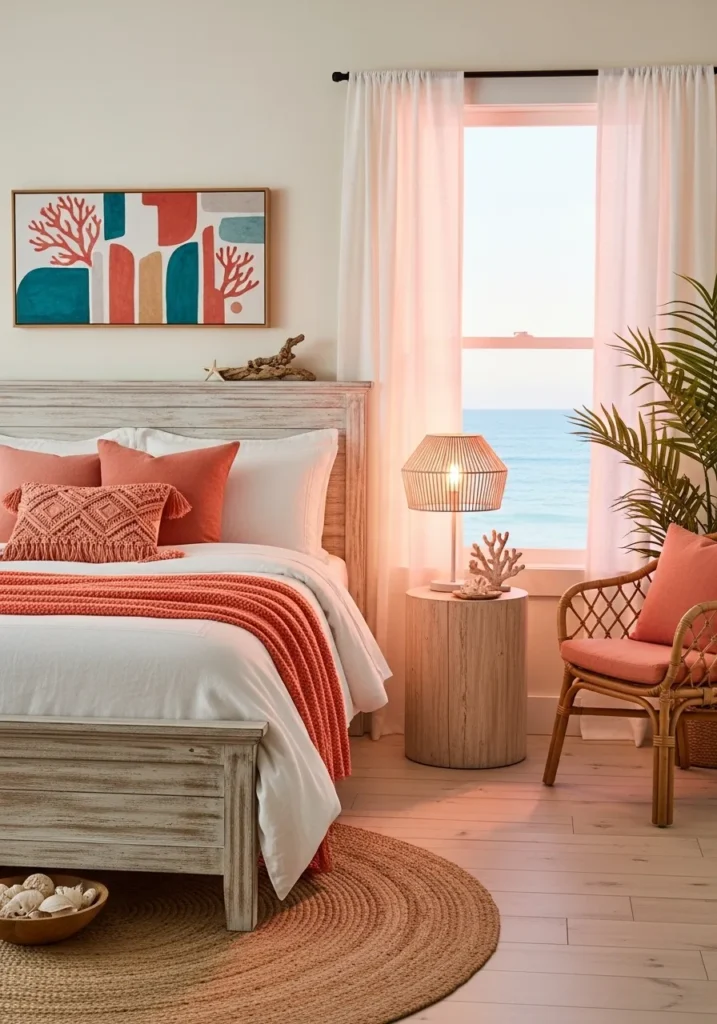 To add a colorful burst to your boho coastal bedroom, add coral glow with vibrant coral accents. Use this color in anything in the room like bedding or throw pillow or wall art or any decorative item or furniture to instantly brighten up the room.