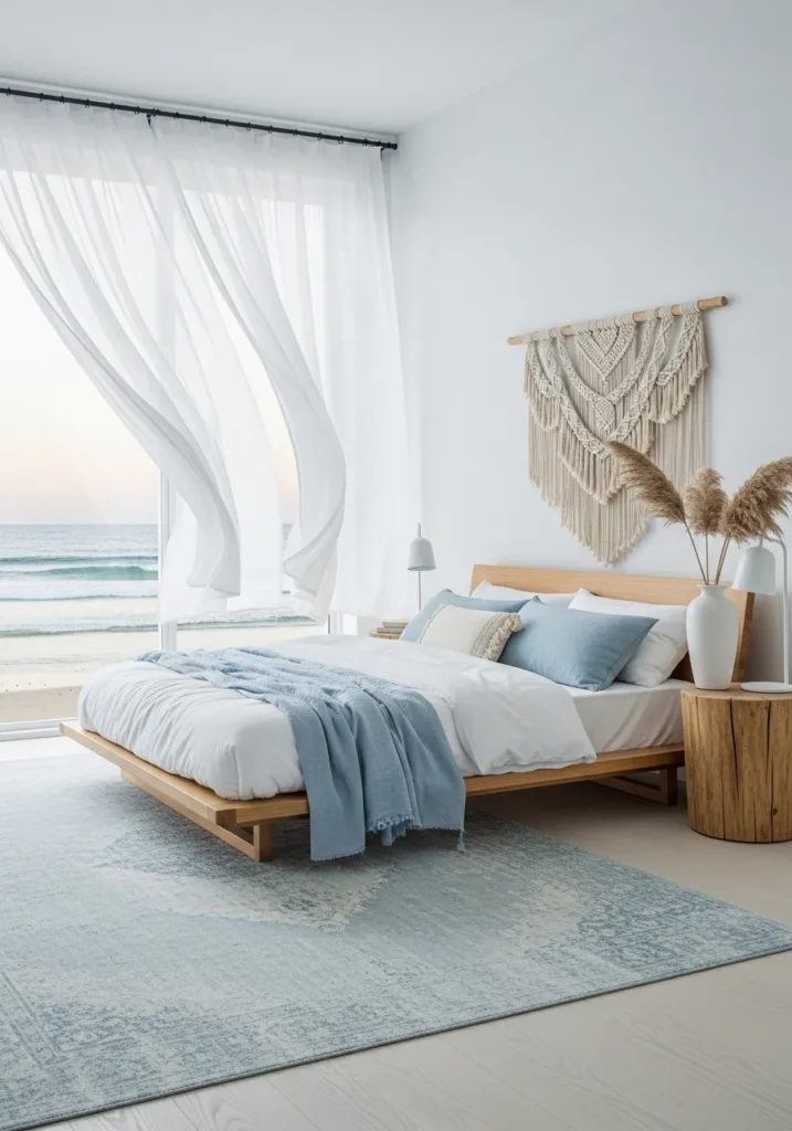 Furniture in light wood or bamboo keeps the space grounded, while soft rugs and linen curtains add movement.