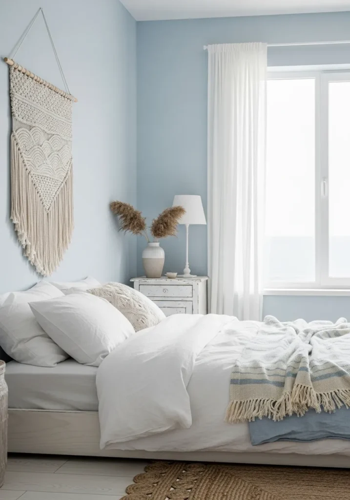 Coastal Haze Escape transforms your bedroom into a serene boho coastal retreat wrapped in cool grays and misty blues. The calm, airy atmosphere feels like a peaceful morning by the sea. Use sheer curtains and minimalist furniture to keep the look light and modern, while soft textures in the bedding add just the right amount of depth. Perfect for anyone who loves a relaxed, ocean-inspired vibe that feels dreamy and refreshing.